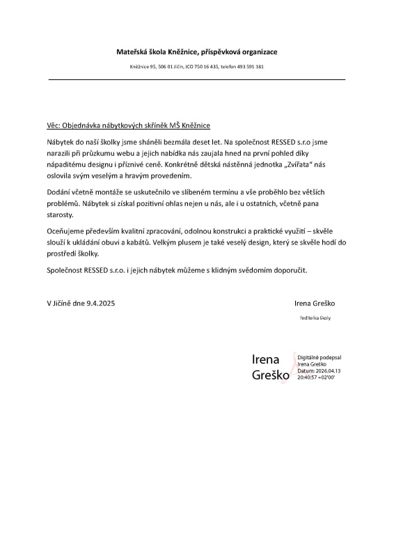 "Nábytek do naší školky jsme sháněli bezmála deset let. Na společnost RESSED s.r.o jsme narazili při průzkumu webu a jejich nabídka nás zaujala hned na první pohled díky nápaditému designu i příznivé ceně. Konkrétně dětská nástěnná jednotka „Zvířata“ nás oslovila svým veselým a hravým provedením.